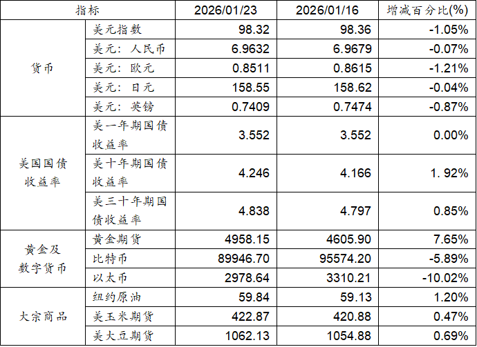1月16日至1月23日,美元指數(shù)上漲0.44%,美元兌人民幣匯率下跌0.07%。美國十年期及三十年期國債收益率均實現(xiàn)上漲。黃金期貨價格上漲7.65%。比特幣下跌5.89%。以太幣下跌10.02%。大宗商品中紐約原油、玉米期貨及大豆期貨價格均呈現(xiàn)上升態(tài)勢。