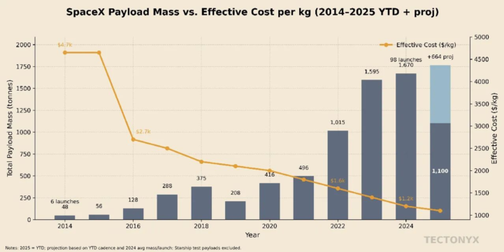 上圖可以看出過去五年全球火箭發射次數和發射載荷質量都在保持快速增長,其中美國貢獻了全球絕大部分的發射和增量市場,中國的發射次數和發射載荷質量整體保持穩定,但和美國的差距反而越來越大。以2025年為例,中國全年發射載荷重量僅為大約250噸,而美國這一數字是接近2800噸,相差10多倍。