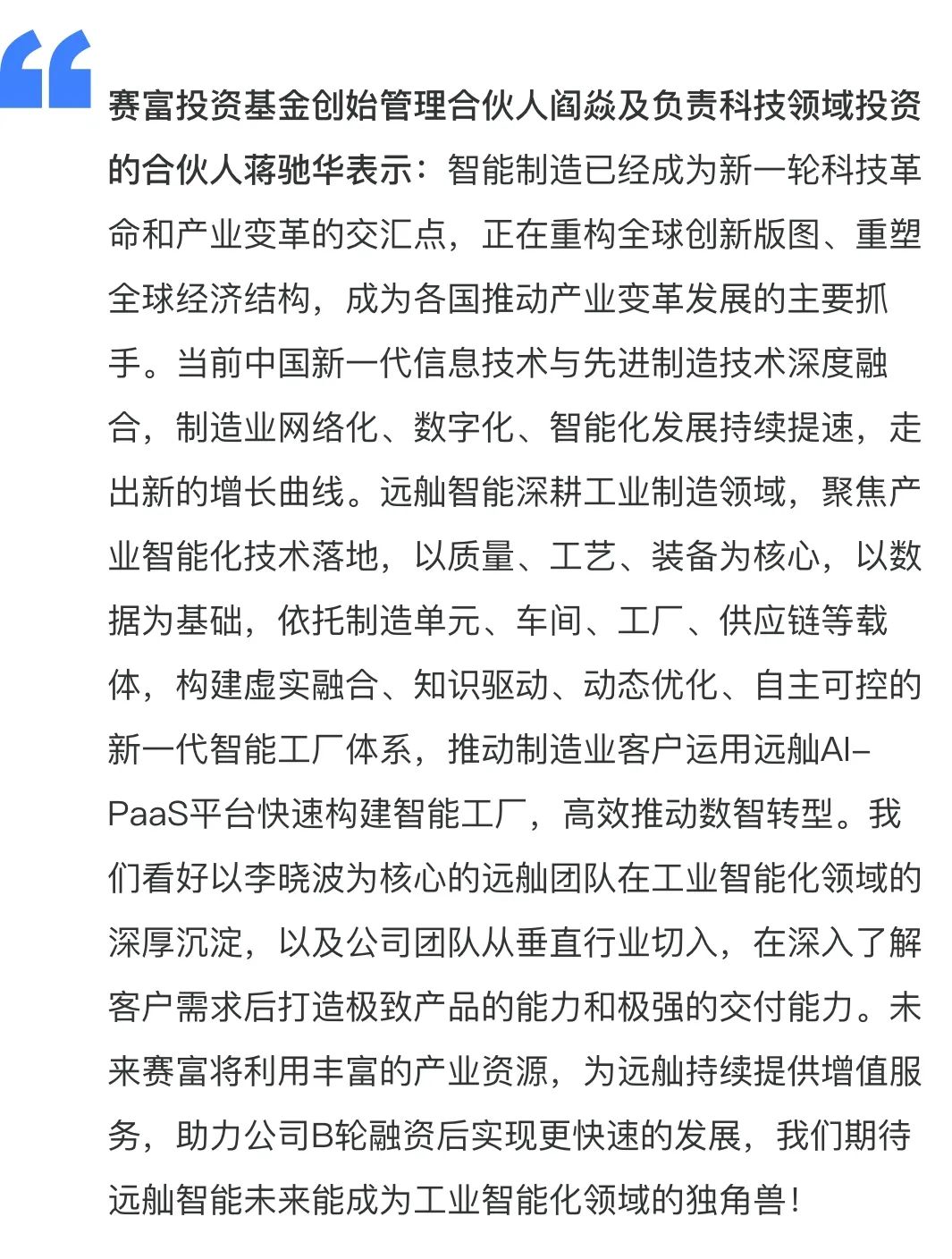 創新型工業AI-PaaS平臺提供商遠舢智能已于近日完成2億元B輪融資,由國內頂級投資機構賽富投資基金領投,上海國資委旗下上實國際創投和國內一線知名機構鼎和高達跟投,同時老股東東方富海、六脈資本持續加碼。頂級創投與頭部產業資本重磅加持,充分驗證了遠舢智能堅定推行的“All in AI& All in PaaS”戰略的成功,進一步鞏固了遠舢在數字化轉型企服市場的引領者位勢。