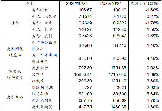 11月11日至11月18日,美元兌其他主流貨幣匯率呈現持續下跌態勢,美元指數下跌3.88%,美元兌人民幣匯率下跌0.27%達到1:7.1574。美國十年期及三十年國債收益率分別下跌1.10%和4.46%。黃金期貨價格上漲0.63%。比特幣和以太幣分別下跌1.89%和3.30%。大宗商品當中,螺紋鋼和玉米期貨價格上漲,而紐約原油和大豆期貨價格分別下降5.34%和1.30%。