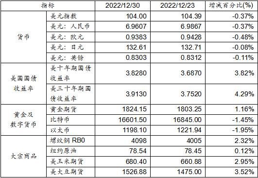 12月23日至12月30日,美元指數下跌0.37%,美元兌人民幣匯率下跌0.37%達到1:6.9607。美國十年期及三十年國債收益率呈現上升態勢,分別收漲于3.8280%和3.9130%。黃金期貨價格上漲1.16%。比特幣下跌1.45%。以太幣下跌1.95%。大宗商品中,紐約原油、玉米期貨、大豆期貨及螺紋鋼價格均呈現上漲態勢。