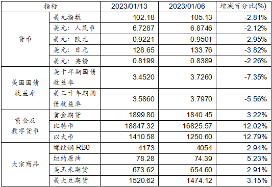 1月6日至1月13日,美元指數(shù)下跌2.81%,美元兌人民幣匯率下跌2.12%達(dá)到1:6.7287。美國(guó)十年期及三十年國(guó)債收益率呈現(xiàn)下跌態(tài)勢(shì),分別收跌于3.4520%和3.5860%。黃金期貨價(jià)格上漲3.22%。比特幣上漲12.02%。以太幣上漲12.79%。大宗商品中,紐約原油、玉米期貨、大豆期貨及螺紋鋼價(jià)格均呈現(xiàn)上漲態(tài)勢(shì)。