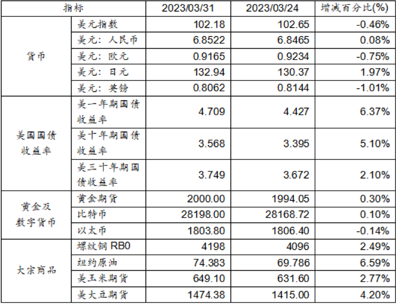 3月24日至3月31日,美元指數下跌0.46%,美元兌人民幣匯率上升0.08%達到1:6.8522。美國一年期、十年期以及三十年其國債收益率呈現上漲。黃金期貨價格上漲0.30%。比特幣上漲0.10%。以太幣下跌0.14%。大宗商品中,螺紋鋼、玉米期貨、紐約原油及大豆期貨價格均呈現上漲態勢。