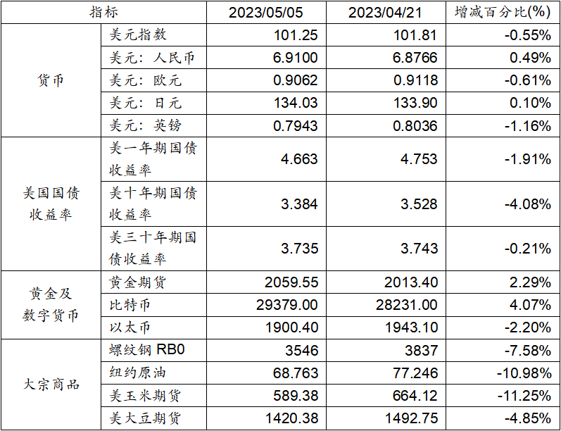4月21日至5月5日,美元指數下跌0.55%,美元兌人民幣匯率上漲0.49%達到1:6.91。美國一年期、十年期以及三十年其國債收益率均呈現下跌態勢。黃金期貨價格上漲2.29%。比特幣上漲4.07%。以太幣下跌2.20%。大宗商品中,螺紋鋼、紐約原油、大豆期貨及玉米期貨價格均呈現下跌態勢。