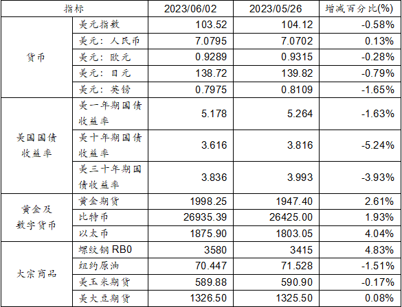 5月26日至6月2日,美元指數下跌0.58%,美元兌人民幣匯率上漲0.13%達到1:7.0795。美國一年期、三年期以及五年期國債收益率均呈現下跌態勢。黃金期貨價格上漲2.61%。比特幣上漲1.93%。以太幣上漲4.04%。大宗商品中,螺紋鋼及大豆期貨價格呈現上漲態勢,而紐約原油及玉米期貨價格則有所下降。