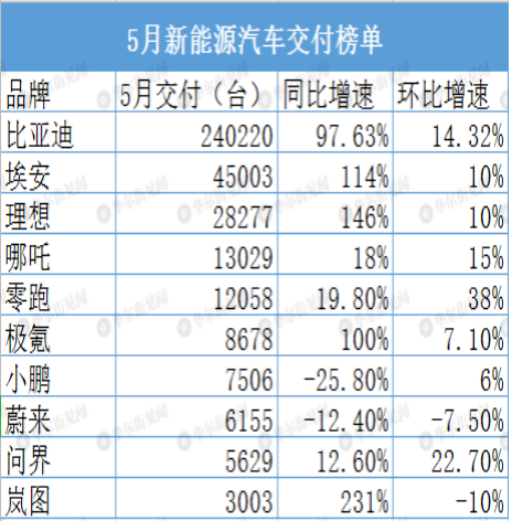 【新能源車企5月成績單揭曉:比亞迪一騎絕塵 埃安創歷史新高 蔚來、小鵬掉隊】