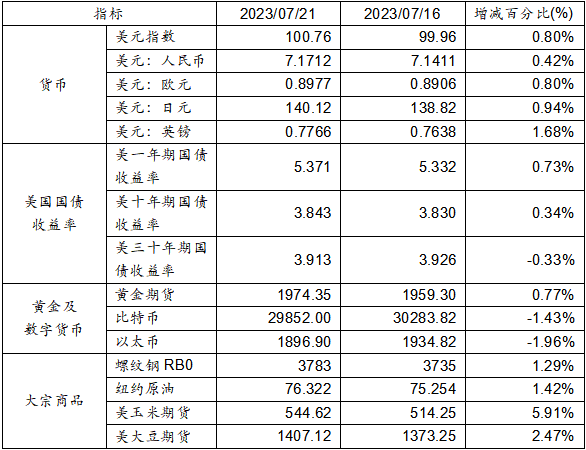 7月16日至7月21日,美元指數(shù)上漲0.80%,美元兌人民幣匯率上漲0.42%達(dá)到1:7.1712。美國(guó)一年期、十年期國(guó)債收益率上漲,三十年期國(guó)債收益率則呈現(xiàn)下跌態(tài)勢(shì)。黃金期貨價(jià)格上漲0.77%。比特幣下跌1.43%。以太幣下跌1.96%。大宗商品中,螺紋鋼、紐約原油、玉米期貨及大豆期貨價(jià)格均呈現(xiàn)上漲態(tài)勢(shì)。