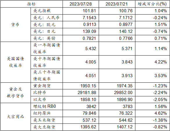 7月21日至7月28日,美元指數上漲1.04%,美元兌人民幣匯率下跌0.24%達到1:7.1543。美國一年期、十年期、三十年其國債收益率均呈現上漲態勢。黃金期貨價格下跌1.23%。比特幣下跌2.24%。以太幣下跌2.05%。大宗商品中,螺紋鋼、紐約原油價格上漲,玉米期貨及大豆期貨價格則出現下跌。