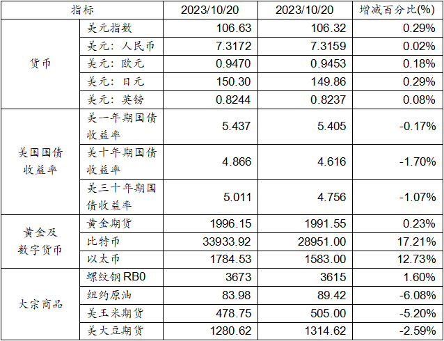 10月20日至10月27日,美元指數(shù)上漲0.29%,美元兌人民幣匯率上升0.02%達(dá)到1:7.3172。美國一年期、十年及三十年國債收益率均下跌。黃金期貨價格上漲0.23%。比特幣上漲17.21%。以太幣上漲12.73%。大宗商品中,螺紋鋼價格上漲,而玉米期貨、紐約原油及大豆期貨價格均出現(xiàn)下跌。