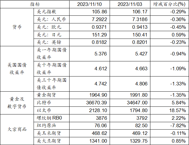 11月3日至11月10日,美元指數(shù)下跌0.29%,美元兌人民幣匯率下跌0.36%達(dá)到1:7.2922。美國一年期、十年及三十年國債收益率均下跌。黃金期貨價格下跌1.35%。比特幣上漲5.84%。以太幣大漲18.57%。大宗商品中,螺紋鋼、大豆期貨價格上漲,而玉米期貨、紐約原油價格均出現(xiàn)下跌。