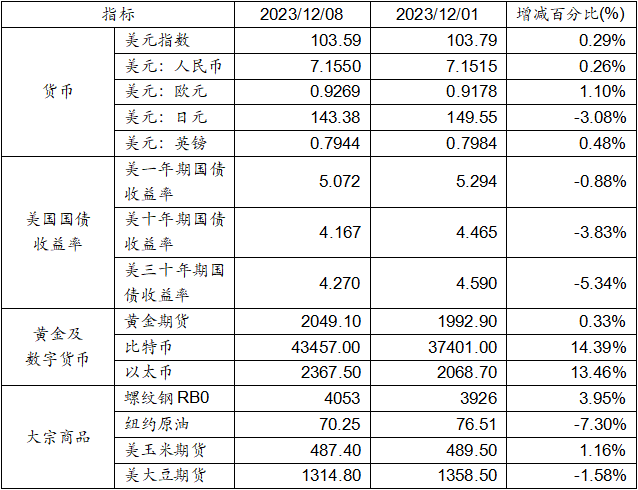 12月1日至12月8日,美元指數上漲0.29%,美元兌人民幣匯率上漲0.26%達到1:7.1550。美國一年期、十年期及三十年期國債收益率均下跌。黃金期貨價格上漲0.33%。比特幣大漲14.39%。以太幣大漲13.46%。大宗商品中,螺紋鋼、玉米期貨價格上漲,而紐約原油及大豆期貨價格則呈現下跌。