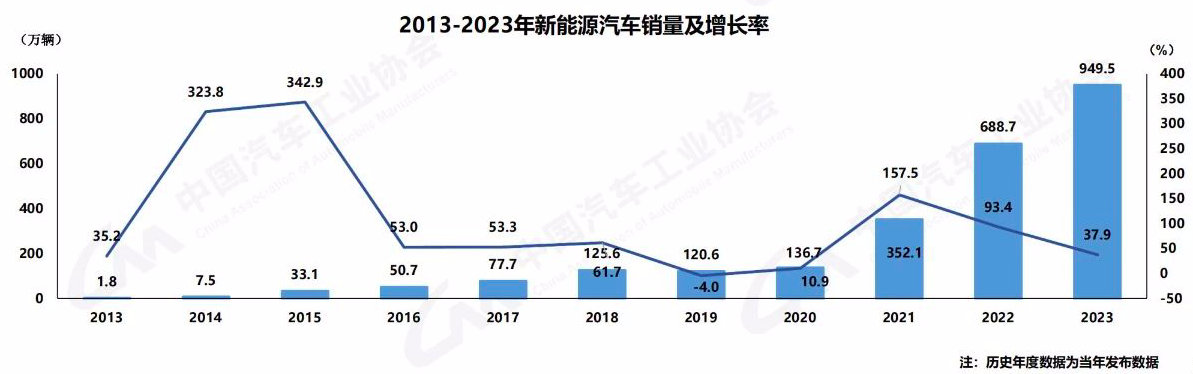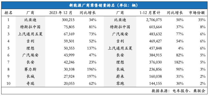 12月,新能源汽車產(chǎn)銷分別完成117.2萬(wàn)輛和119.1萬(wàn)輛,同比分別增長(zhǎng)47.5%和46.4%,市場(chǎng)占有率達(dá)到37.7%。其中,新能源商用車產(chǎn)銷分別占商用車產(chǎn)銷的17.4%和17.5%;新能源乘用車產(chǎn)銷分別占乘用車產(chǎn)銷的40.9%和40.4%。在政策和市場(chǎng)的雙重作用下,2023年新能源汽車持續(xù)快速增長(zhǎng),新能源汽車產(chǎn)銷分別完成958.7萬(wàn)輛和949.5萬(wàn)輛,同比分別增長(zhǎng)35.8%和37.9%,市場(chǎng)占有率達(dá)到31.6%,高于上年同期5.9個(gè)百分點(diǎn)。其中,新能源商用車產(chǎn)銷分別占商用車產(chǎn)銷11.5%和11.1%;新能源乘用車產(chǎn)銷分別占乘用車產(chǎn)銷的34.9%和34.7%。