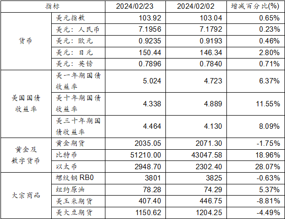 2月2日至2月23日,美元指數上漲0.65%,美元兌人民幣匯率上漲0.23%達到1:7.1956。美國一年期、十年期及三十年其國債收益率均明顯上漲。黃金期貨價格下跌1.75%。比特幣大漲18.96%。以太幣大漲28.07%。大宗商品中,紐約原油價格上漲,而螺紋鋼、大豆期貨及玉米期貨價格則呈現上漲態勢。