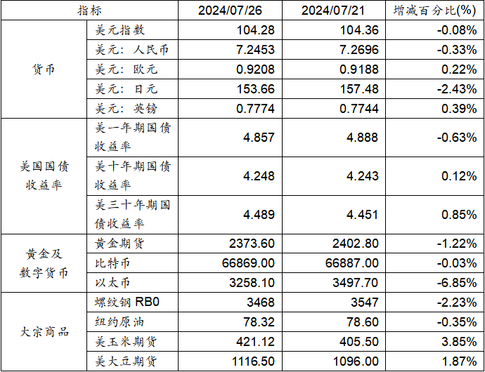 7月21日至7月26日,美元指數下跌0.08%,美元兌人民幣匯率下跌0.33%至1:7.2453。美國一年期國債收益率下跌,而十年期及三十年期國債收益率均呈現上漲態勢。黃金期貨價格下跌1.22%。比特幣下跌0.03%。以太幣下跌6.85%。大宗商品中,玉米期貨及大豆期貨價格上漲,而螺紋鋼及紐約原油價格均呈現下跌態勢。