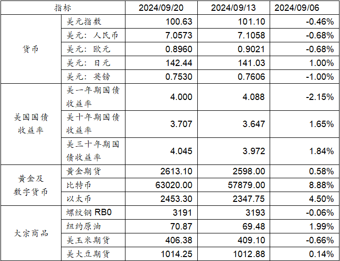 9月13日至9月20日,美元指數下跌0.46%,美元兌人民幣匯率下跌0.68%至1:7.0573。美國一年期國債收益率下跌,而十年期及三十年期國債收益率則呈現上漲態勢。黃金期貨價格上漲0.58%。比特幣上漲8.88%。以太幣上漲4.50%。大宗商品中螺紋鋼及玉米期貨價格下跌,而紐約原油及大豆期貨價格則呈現上漲態勢。
