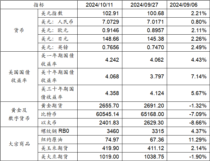 9月27日至10月11日,美元指數(shù)上漲2.21%,美元兌人民幣匯率上漲0.80%至1:7.0729。美國一年期國債、十年期及三十年期國債收益率均呈現(xiàn)上漲態(tài)勢。黃金期貨價格下跌1.32%。比特幣下跌7.09%。以太幣下跌8.66%。大宗商品中螺紋鋼、紐約原油及玉米期貨價格上漲,而大豆期貨價格則呈現(xiàn)下跌態(tài)勢。