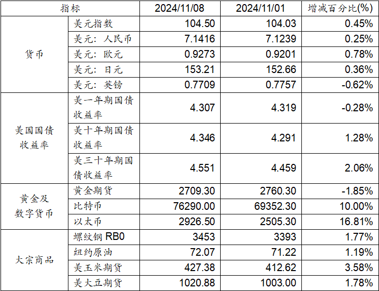 11月1日至11月8日,美元指數(shù)上漲0.45%,美元兌人民幣匯率上漲0.25%。美國(guó)一年期國(guó)債收益率下跌,而十年期及三十年期國(guó)債收益率則呈現(xiàn)上漲態(tài)勢(shì)。黃金期貨價(jià)格下跌1.85%。比特幣大漲10.00%。以太幣大漲16.81%。大宗商品中螺紋鋼、紐約原油、玉米期貨及大豆期貨價(jià)格均呈現(xiàn)上漲態(tài)勢(shì)。