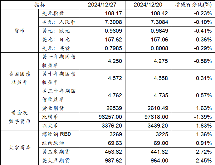 12月20日至12月27日,美元指數下跌0.23%,美元兌人民幣匯率下跌0.10%。美國一年期國債收益率下跌,而十年期及三十年期國債收益率則呈現上漲態勢。黃金期貨價格上漲1.63%。比特幣下跌1.39%。以太幣下跌1.83%。大宗商品中螺紋鋼、紐約原油、玉米期貨價格及大豆期貨價格均呈現上漲態勢。