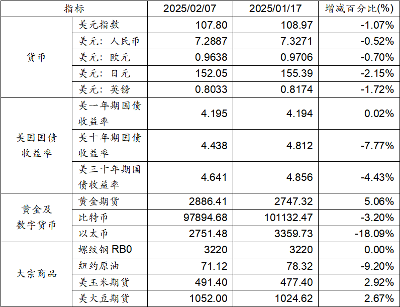 1月24日至2月7日,美元指數(shù)下跌1.07%,美元兌人民幣匯率下跌0.52%。美國一年期國債收益率上升,而十年期及三十年期國債收益率則呈現(xiàn)下跌態(tài)勢。黃金期貨價格上漲5.06%。比特幣下跌3.20%。以太幣下跌18.09%。大宗商品中紐約原油價格下跌,而大豆期貨及玉米期貨的價格則呈現(xiàn)上漲態(tài)勢。