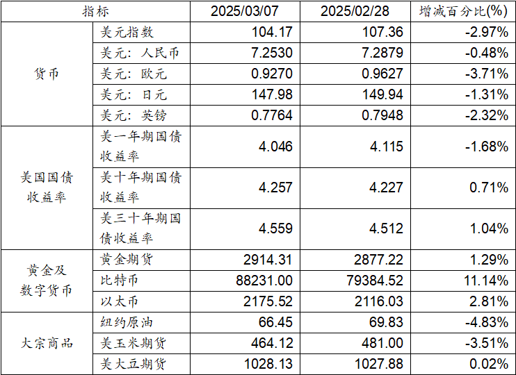 2月28日至3月7日,美元指數(shù)下跌2.97%,美元兌人民幣匯率下跌0.48%。美國一年期國債收益率下跌,而十年期及三十年期國債收益率則呈現(xiàn)上漲態(tài)勢(shì)。黃金期貨價(jià)格上漲1.29%。比特幣大漲11.14%。以太幣上漲2.81%。大宗商品中紐約原油、及玉米期貨下跌,而大豆期貨價(jià)格則略有上浮。