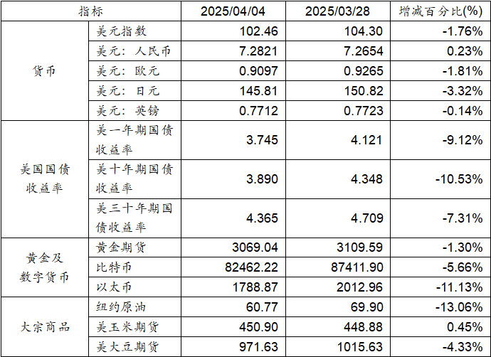 3月28日至4月4日,美元指數下跌1.76%,美元兌人民幣匯率上漲0.23%。美國一年期、十年期及三十年期國債收益率均呈現大幅度下跌態勢。黃金期貨價格下跌1.30%。比特幣下跌5.66%。以太幣下跌11.13%。大宗商品中紐約原油和大豆期貨價格下跌,而玉米期貨價格則有小幅度上漲。
