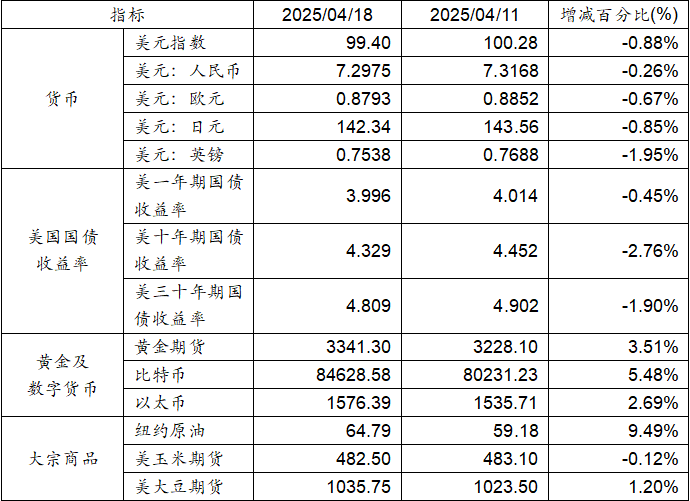 4月11日至4月18日,美元指數(shù)下跌0.88%,美元兌人民幣匯率下跌0.26%。美國(guó)一年期、十年期及三十年期國(guó)債收益率均呈現(xiàn)下滑態(tài)勢(shì)。黃金期貨價(jià)格上漲3.51%。比特幣上漲5.48%。以太幣上漲2.69%。大宗商品中紐約原油、大豆期貨價(jià)格上漲,而玉米期貨價(jià)格則有所下跌。