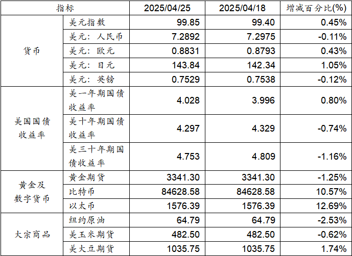 4月18日至4月25日,美元指數上漲0.45%,美元兌人民幣匯率下跌0.11%。美國一年期國債收益率上漲,而十年期及三十年期國債收益率則呈現下滑態勢。黃金期貨價格下跌1.25%。比特幣大漲10.57%。以太幣大漲12.69%。大宗商品中紐約原油及玉米期貨價格則有所下跌,大豆期貨價格上漲。