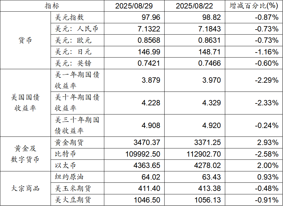 8月22日至8月29日,美元指數下跌0.87%,美元兌人民幣匯率下跌0.73%。美國一年期、十年期及三十年期國債收益率均呈現(xiàn)下降態(tài)勢。黃金期貨價格上漲2.93%。比特幣下跌2.58%。以太幣上漲2.00%。大宗商品紐約原油價格上漲,而玉米期貨及大豆期貨價格則呈現(xiàn)下跌態(tài)勢。