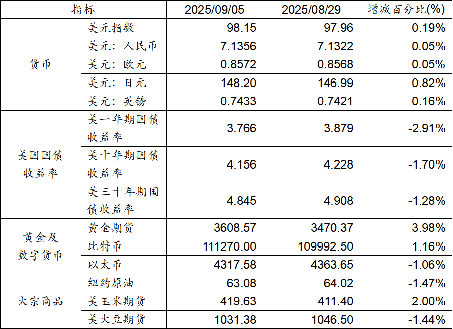 8月29日至9月5日,美元指數(shù)上漲0.19%,美元兌人民幣匯率上漲0.05%。美國一年期、十年期及三十年期國債收益率均呈現(xiàn)下降態(tài)勢。黃金期貨價格上漲3.98%。比特幣上漲1.16%。以太幣下跌1.06%。大宗商品玉米期貨價格上漲,而紐約原油及大豆期貨價格則呈現(xiàn)下跌態(tài)勢。