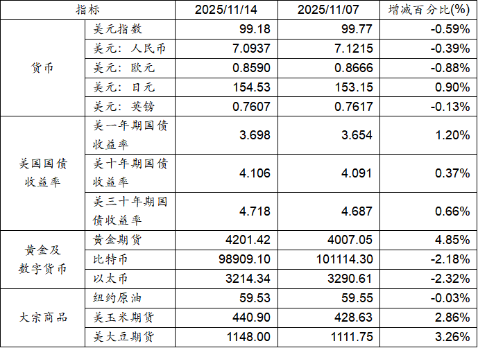 11月7日至11月14日,美元指數下跌0.59%,美元兌人民幣匯率下跌0.30%。美國一年期、十年期及三十年期國債收益率均呈現上漲態勢。黃金期貨價格上漲4.85%。比特幣下跌2.18%。以太幣下跌2.32%。大宗商品中紐約原油價格下跌,而玉米期貨及大豆期貨價格則呈現上漲態勢。
